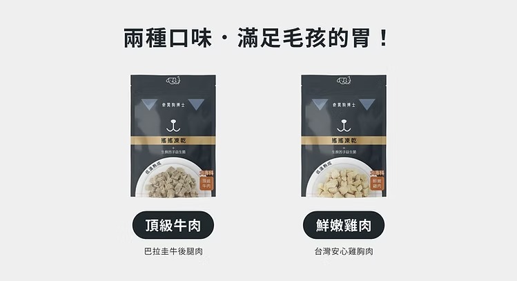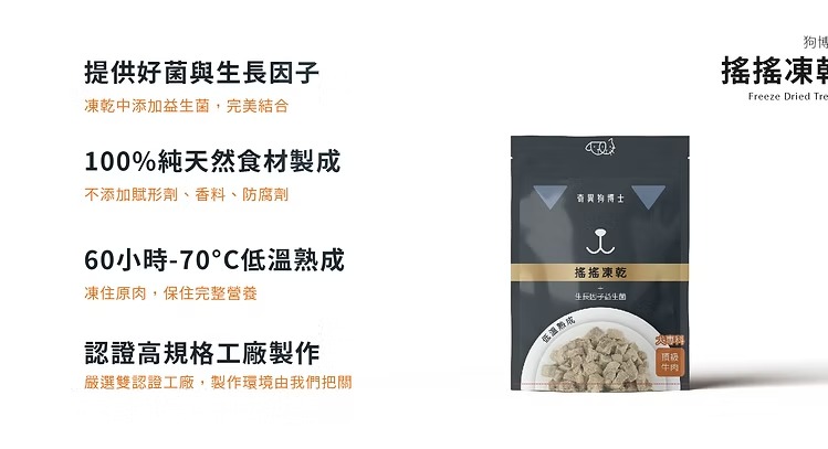 附一包奇異狗博士科學實證三倍效益生菌,不經高溫加工破壞益生菌的活性。食用前加入、「搖搖」混合均勻,寵物吃零食也能享有美味與健康。