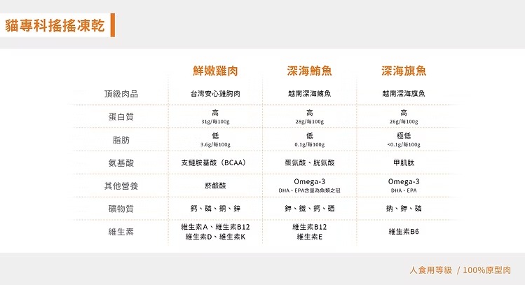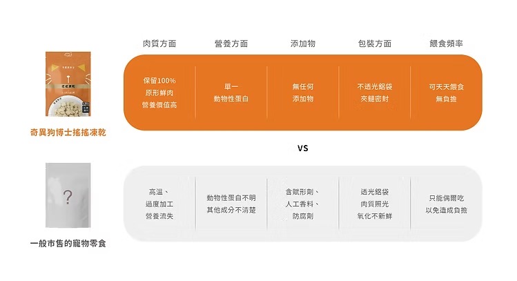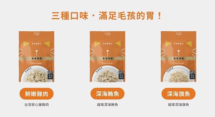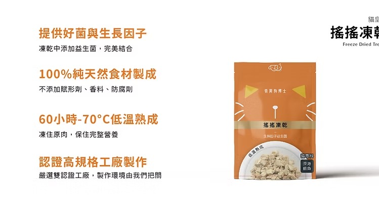 使用可溯源的安心肉品,100%原肉製成,透過凍乾技術保留肉品營養。