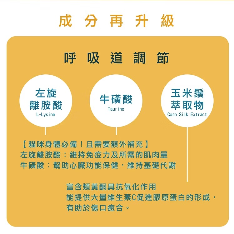 ◆呼吸道:純正左旋離胺酸+ 牛磺酸、玉米鬚萃取物