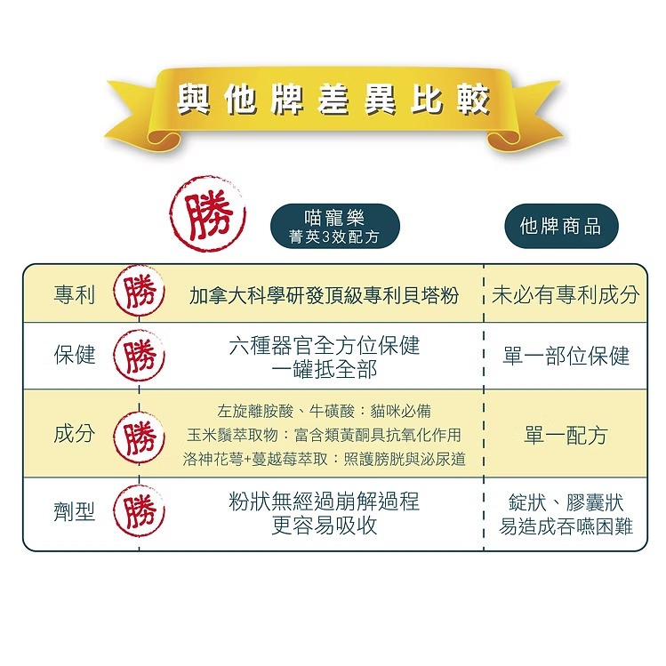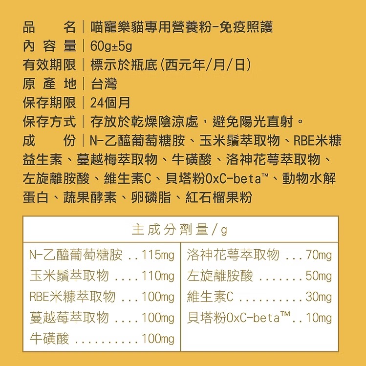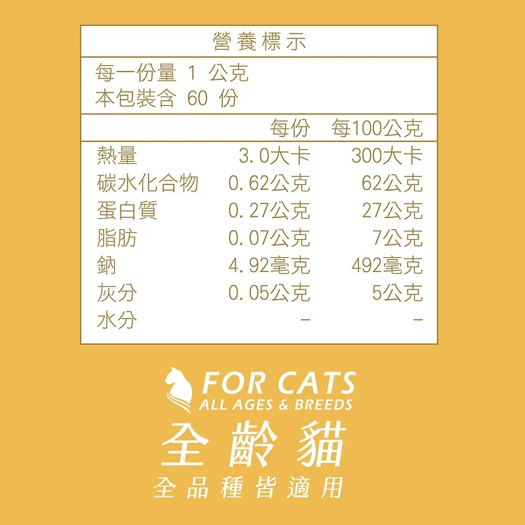 劑 型:粉劑建議用量:5公斤貓一天1匙(1G)、超過5公斤一天二匙(2G)。