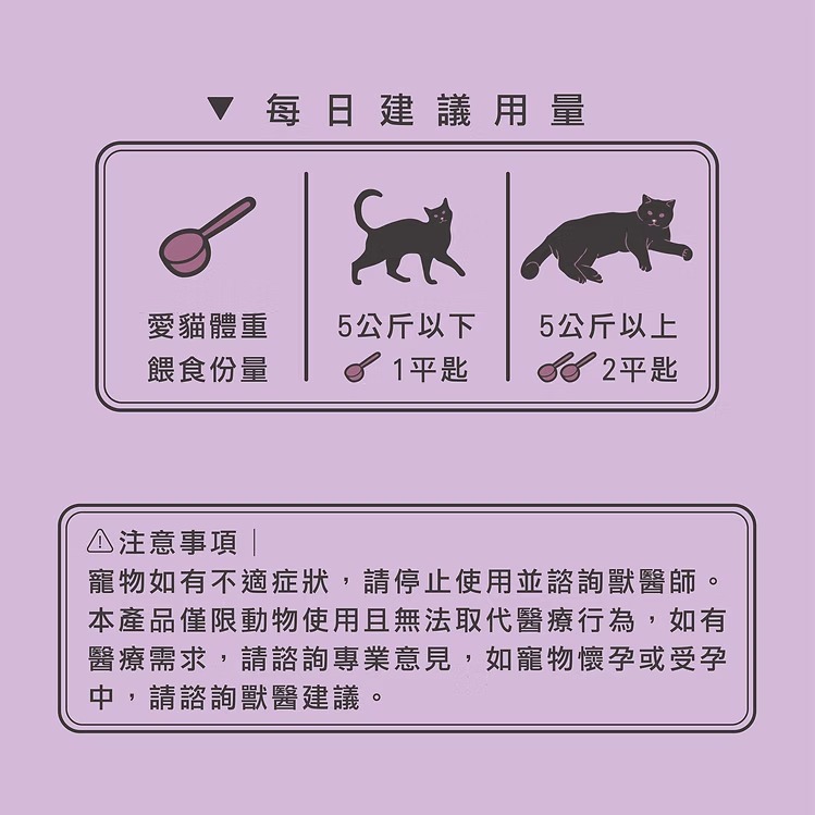 建議用量:5公斤貓一天1匙、超過5公斤一天二匙
