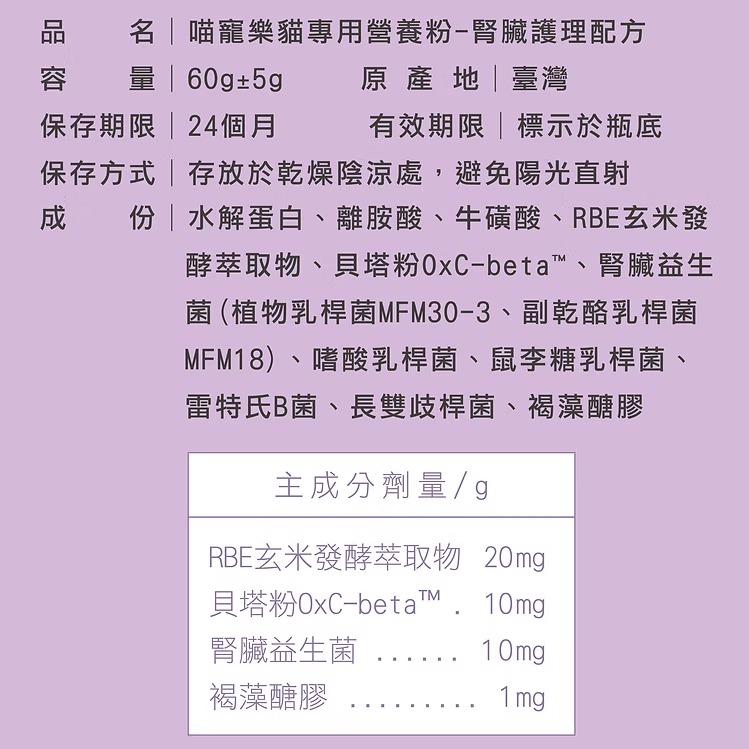 品  名:喵寵樂貓專用營養粉-腎臟護理配方
