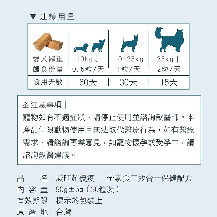 建議用量│10公斤以下 0.5粒/天、10-25公斤 1粒/天、25公斤以上 2粒/天\